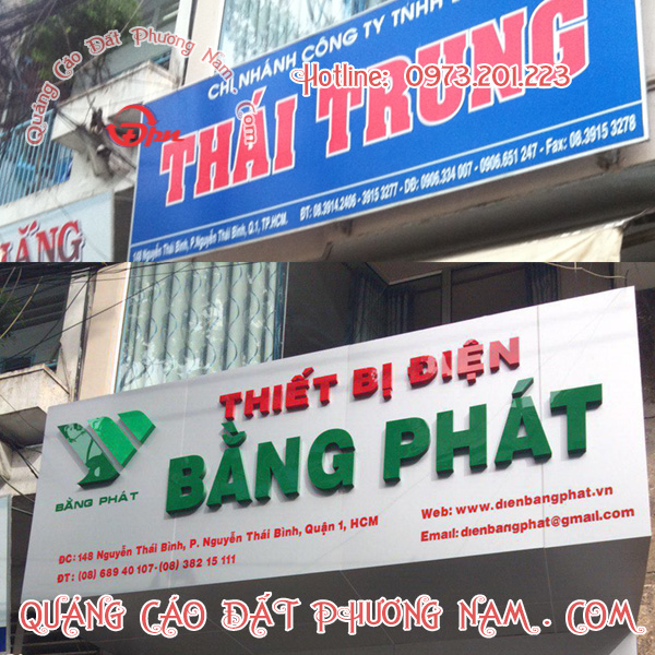 Công ty quảng cáo Đất Phương Nam chuyên thiết kế – thi công các loại bảng hiệu quảng cáo Aluminium 550.000đ/m2, bảng hiệu Hiflex 240.000đ/m2, hộp đèn, chữ nổi mica,chữ nổi inox , Đồng, chữ nổi Led…Với chất lượng và giá cả tốt nhất.